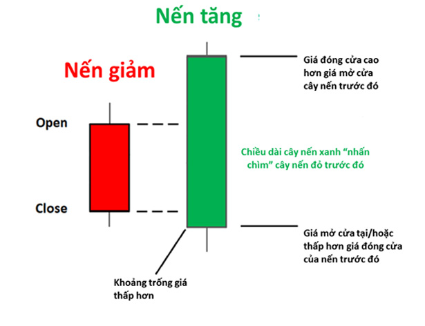 Mô hình này bao gồm hai nến, trong đó nến thứ hai là một nến tăng lớn bao phủ toàn bộ thân nến giảm trước đó.