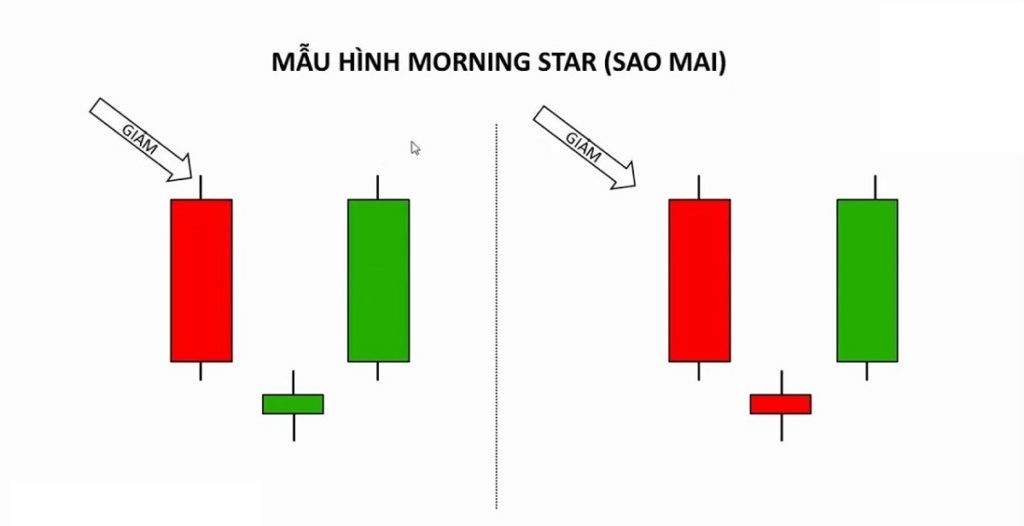 (Hình minh họa: xu hướng giảm → xuất hiện mô hình Morning Star → bên mua chiếm ưu thế → giá đảo chiều tăng).